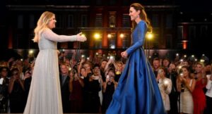 Then, with a serene smile, Princess Kate stepped onto the stage, wearing a flowing sapphire gown, her presence both regal and comforting. Together, the duo launched into a soul-stirring rendition of “True Colors” by Cyndi Lauper—a ballad about embracing oneself and finding strength even in life’s darkest moments.