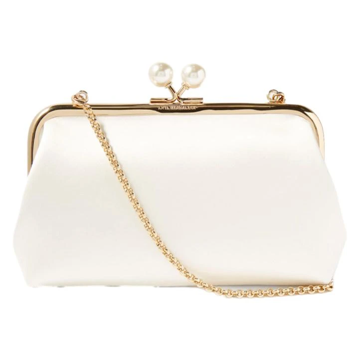 In her hand, she carried the Anya Hindmarch Maud clutch in ivory. The piece features decorative pearls on the bag’s gold frame closure. It’s made from recycled Satin.