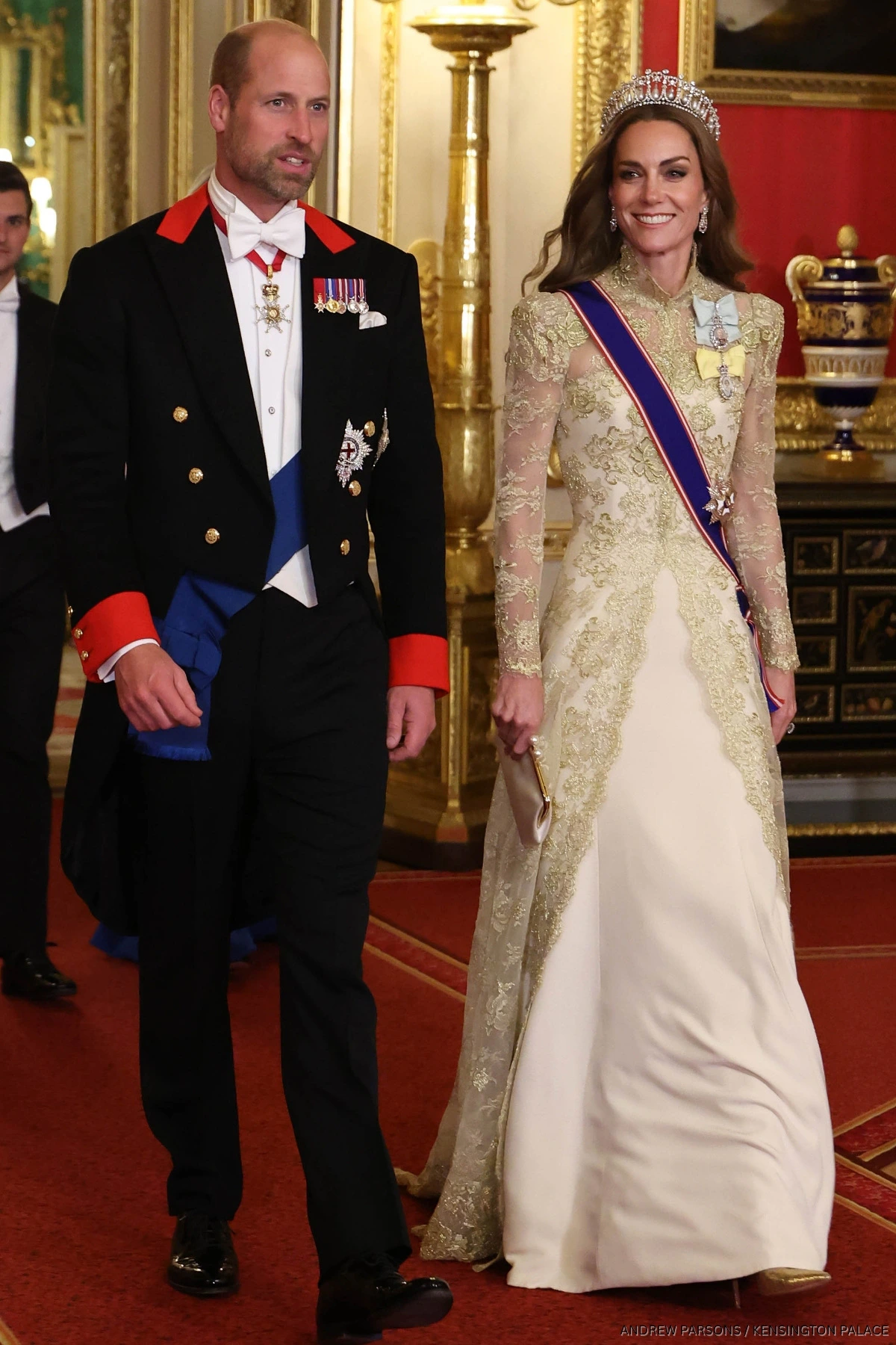 The blue ribbon is the Royal Family Order of King Charles III. This banquet marked the second time Kate had worn the King’s RFO in public.