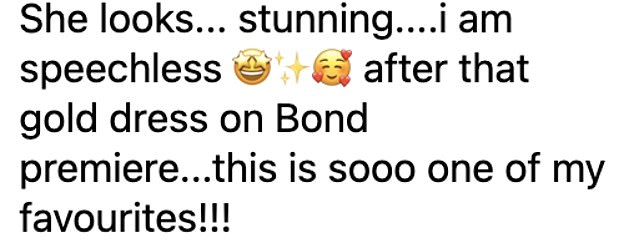 In a similar vein, another said: ‘She looks… stunning….i am speechless. After that gold dress on Bond premiere…this is sooo one of my favourites!!!’