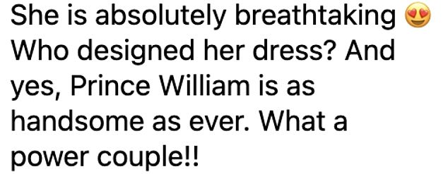 Another added: ‘She is absolutely breathtaking. Who designed her dress? And yes, Prince William is as handsome as ever. What a power couple!!’