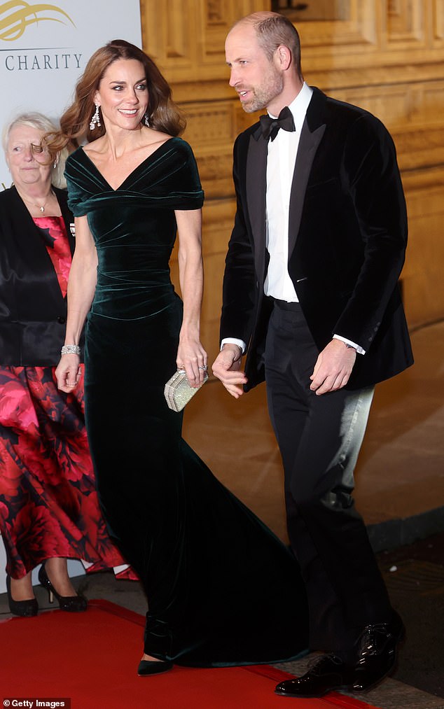 Arriving outside the main entrance to the building before taking their seats in the Royal Box, the Princess was the picture of elegance in a green velvet evening gown, while William looked dapper in black tie.