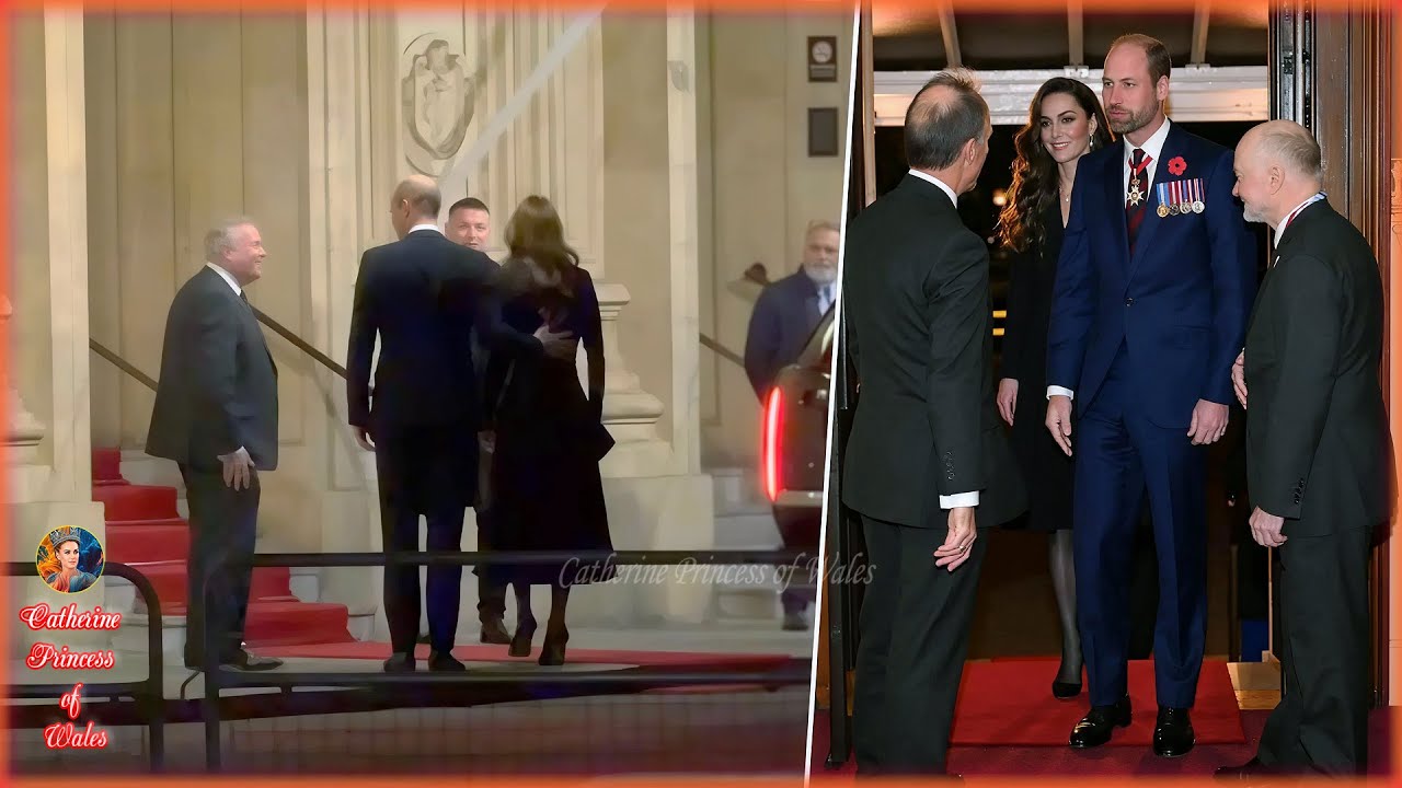 The Prince and Princess of Wales arrived together, symbolizing continuity and remembrance within the monarchy. Prince William was captured placing a gentle, protective hand on his wife’s back—a tender gesture underscoring their close bond. They ascended the venue’s grand steps, greeted warmly by organizers and Royal British Legion representatives.