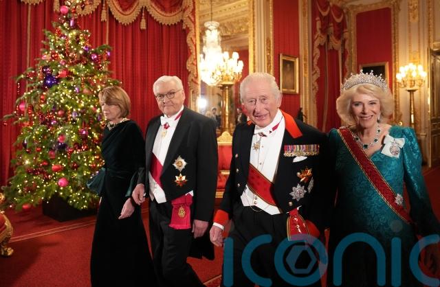Camilla paired her outfit with diamond earrings, an emerald and diamond necklace and the Order of Germany sash.