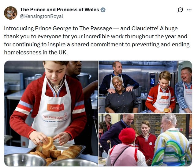 Posting on social media on Sunday, the Prince and Princess of Wales shared sweet snaps of Prince George at The Shelter, adding: ‘Introducing Prince George to The Passage — and Claudette!