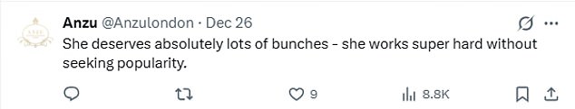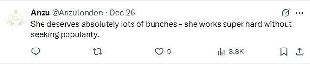 A third said: ‘She deserves absolutely lots of bunches – she works super hard without seeking popularity.’