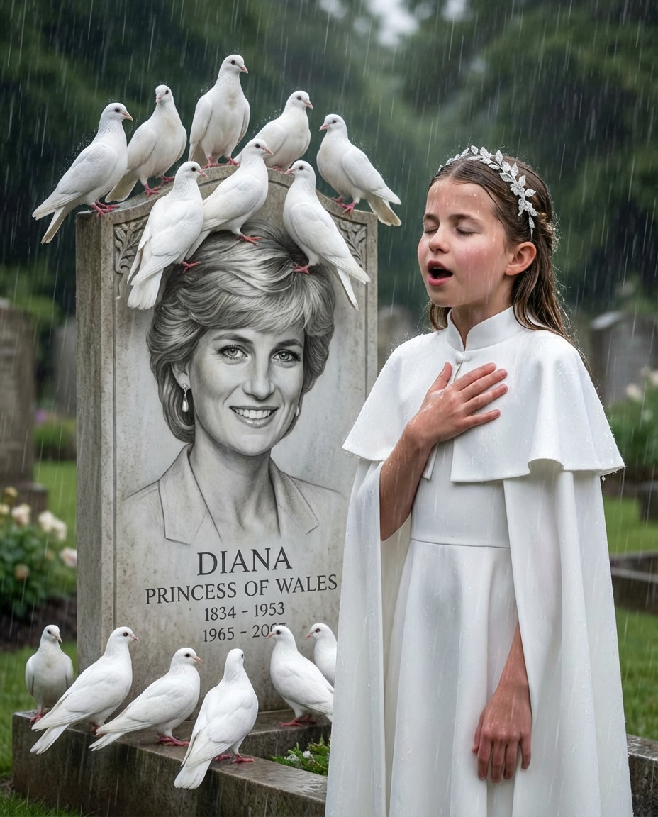 In a deeply moving moment that touched many hearts, Princess Charlotte was recently seen standing before the grave of her late grandmother, Princess Diana. This poignant scene took place on a rainy day, as the young princess placed a hand on her chest and sang “See You Again,” a song that resonates with themes of loss and remembrance. White doves gathered around the tombstone added to the beauty and symbolic significance of the occasion.