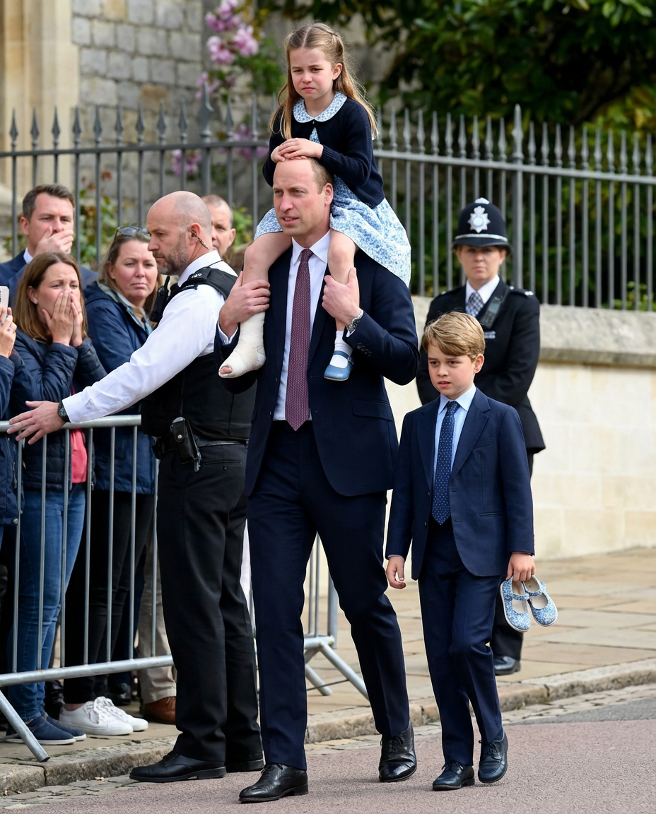 While Prince William cared for Charlotte, Prince George showed remarkable maturity for his age. Standing behind his sister, he held one of Charlotte’s shoes, a small but meaningful gesture illustrating his role as a caring older brother. His concern for his sister’s health was evident, and many witnesses noted that this moment highlighted the strong bond between the two siblings.