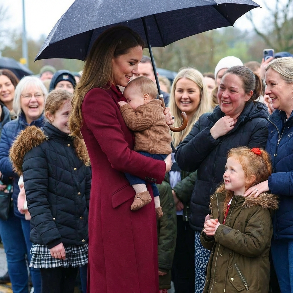 Witnesses were moved as the toddler buried her face into Catherine’s coat, refusing to let go for several moments. The Princess, known for her maternal and patient demeanor, was seen smiling warmly and reciprocating the affection. Later, Catherine was photographed crouching to eye-level with a group of children to accept hand-picked bouquets, further showcasing her signature style of “eye-to-eye” engagement.