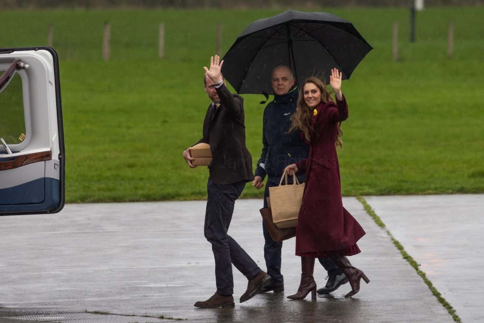 Without a moment’s hesitation, Prince William was at her side. Breaking away from formal conversation, his reaction was that of a partner first and a Prince second. As the rain cascaded around them, William ignored the cameras and the damp ground, kneeling directly in the water to attend to his wife.