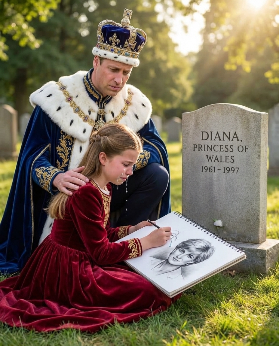 As Charlotte sat by her grandmother’s grave, her artistic endeavor became a heartfelt tribute. The young princess wept as she painted, tears falling onto the canvas, symbolizing the deep emotional connection she felt to Diana’s memory. This moment captured the innocence of childhood intertwined with the profound sadness of loss. Prince William, witnessing his daughter’s emotions, placed a comforting hand on her shoulder, offering his support and love during this difficult time.