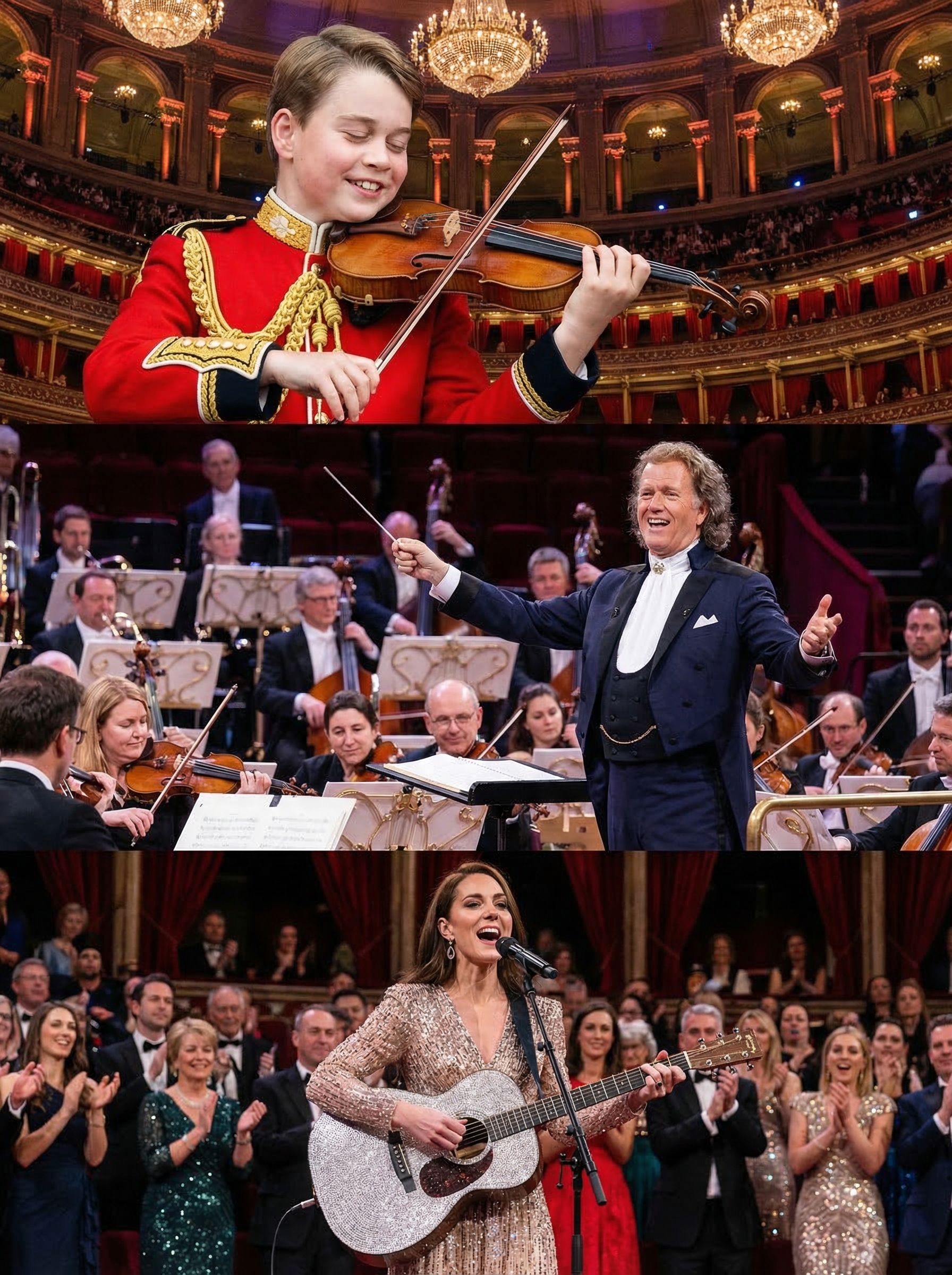 The prestigious Royal Albert Hall recently played host to an extraordinary event that seamlessly blended classical mastery with royal elegance. What was expected to be a standard evening of music quickly turned into a historic milestone, as Princess Kate and Prince George joined the world-renowned maestro André Rieu for a performance that left the audience in awe. 🌟