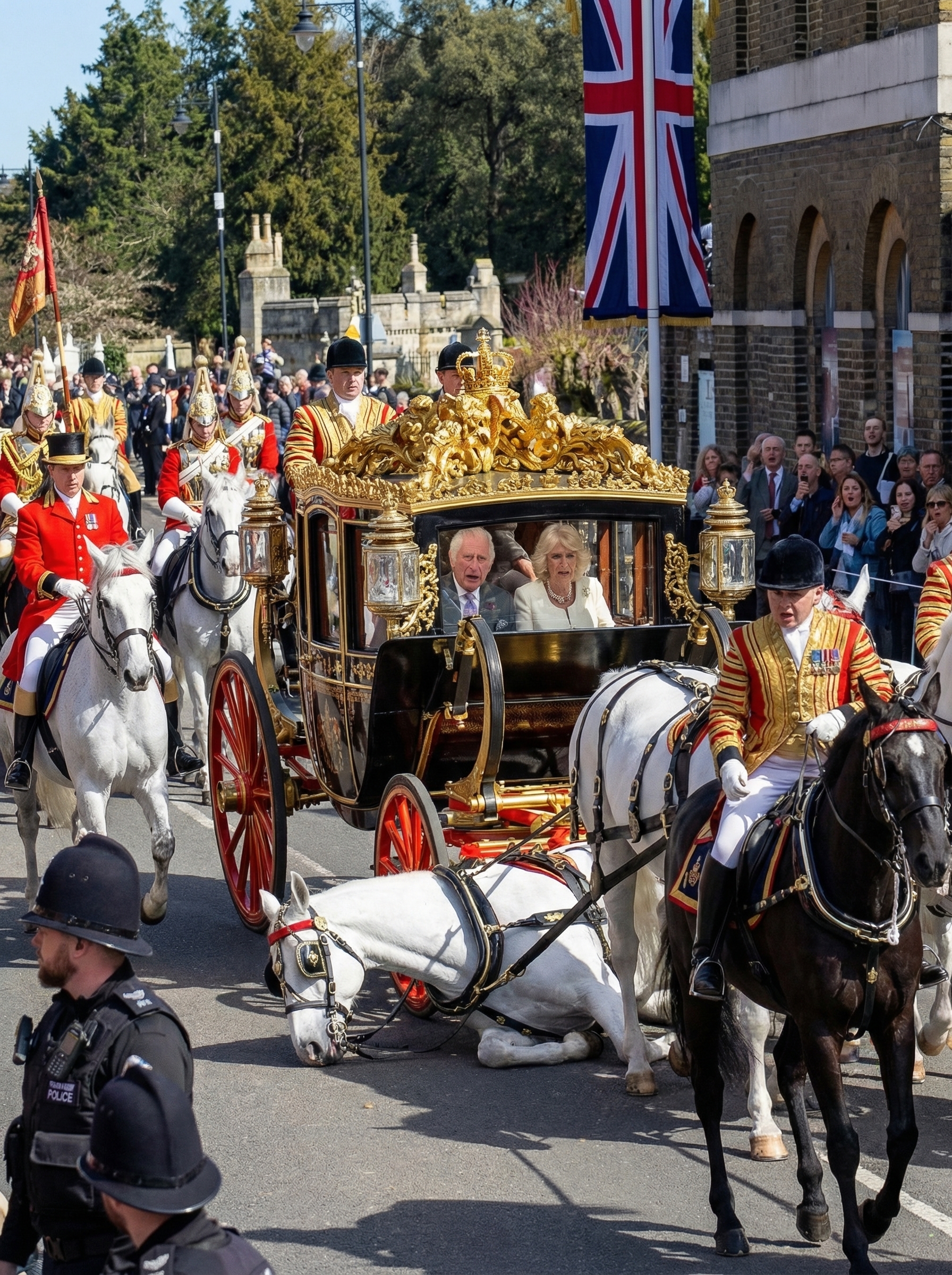 King Charles, known for his deep love of animals and equestrian sports, appearedĀ visibly alarmed, leaning over the side of the carriage to assess the situation.Ā Queen CamillaĀ was seen clutching the side of the vehicle, her expression one of profound shock and concern as the horse struggled against its leather restraints.