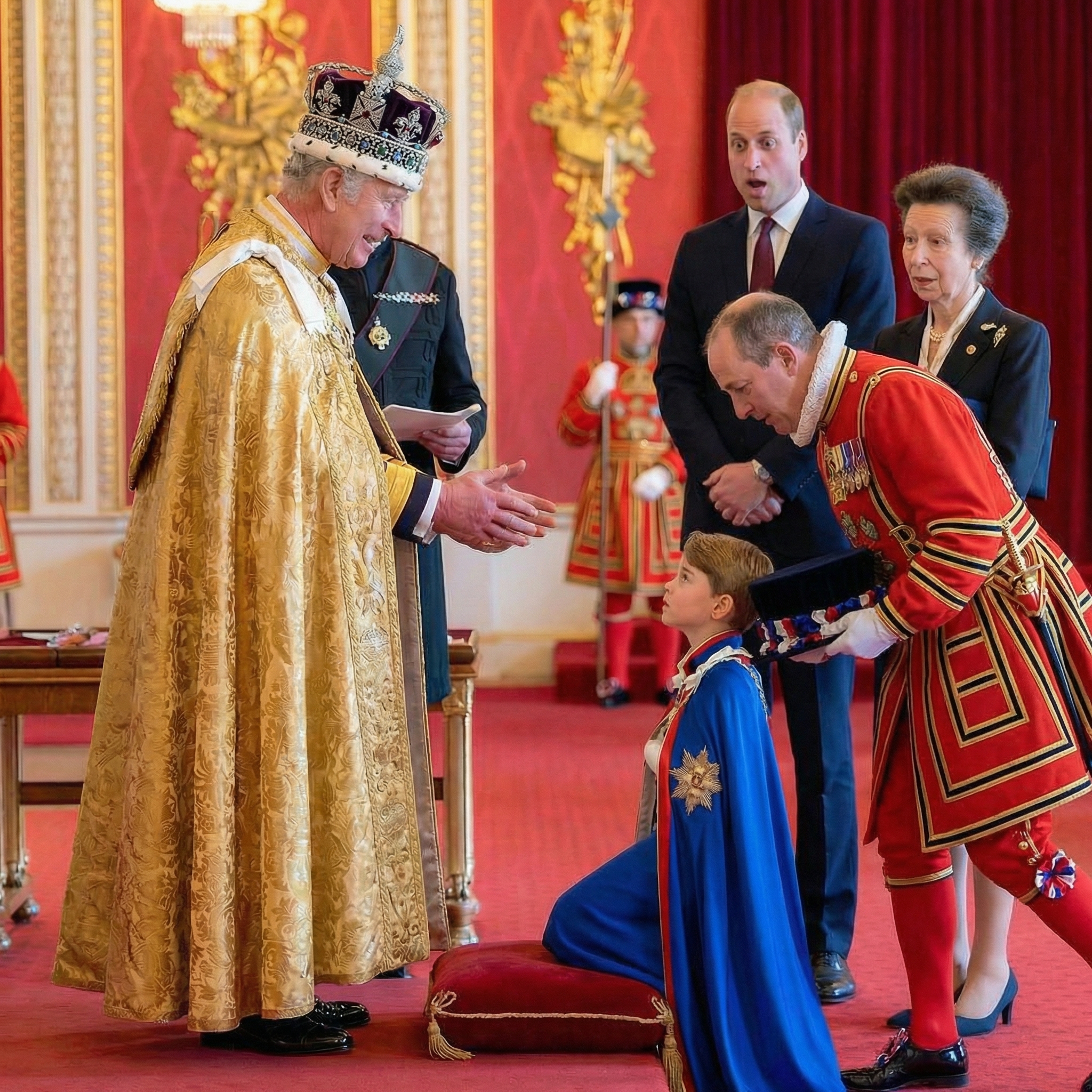 Known for his thoughtful presents, King Charles delivered a gift that transcended mere materialism. As Prince George knelt before his grandfather, who held a royal scepter and pointed it towards him, the moment was charged with emotion. A royal guard stood nearby, holding the Crown and royal robes, creating a vivid tableau of tradition and expectation. 🏰👑