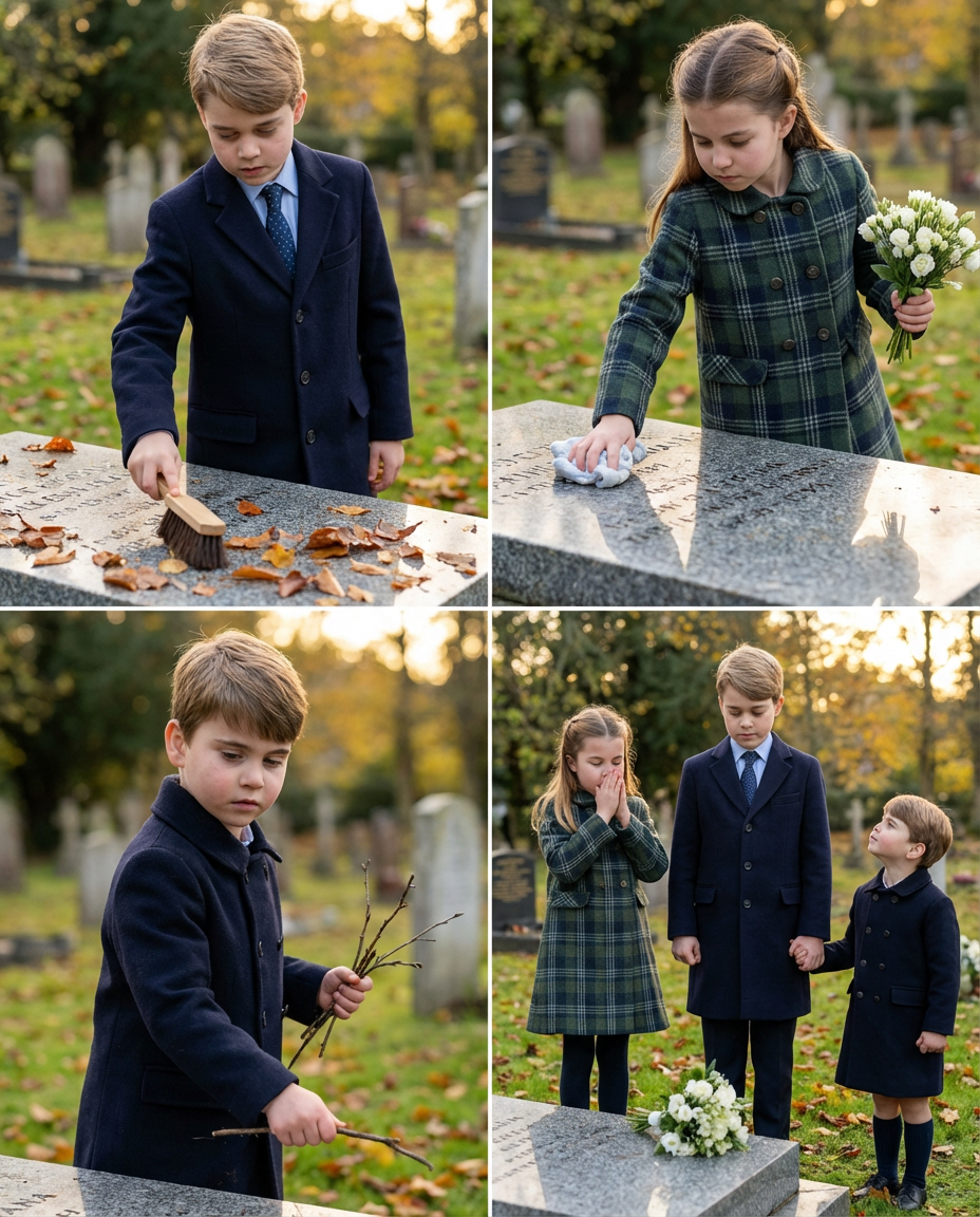 On a peaceful day, the three siblings visited Diana’s grave together, each carrying a small bouquet of flowers. George, the eldest, showed a sense of responsibility by carefully sweeping away the fallen leaves from the grave. His actions demonstrated a maturity beyond his years, showing the respect and care Diana deserved.