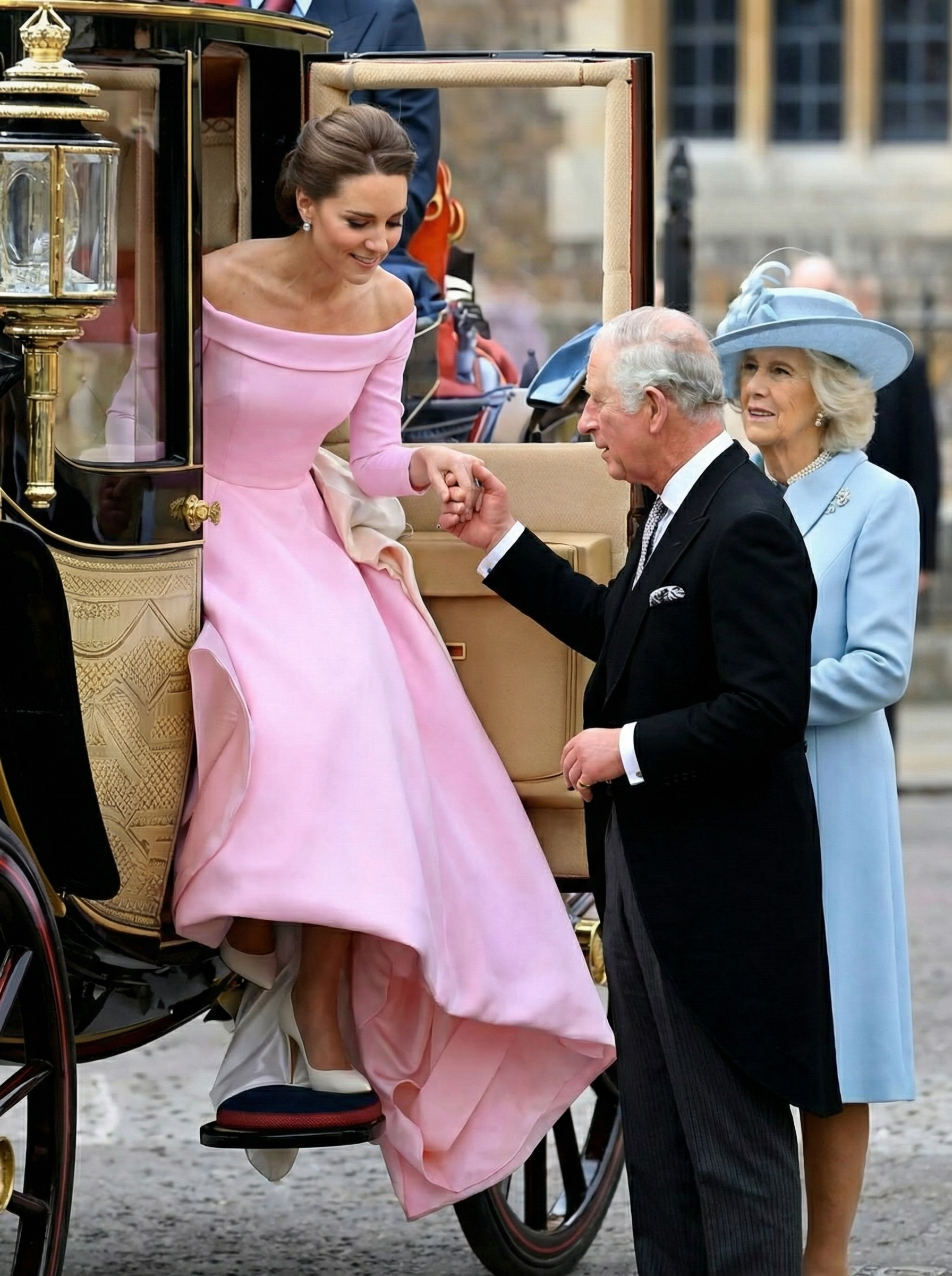 Without missing a beat, King Charles, ever the gentleman and patriarch of the family, stepped forward. With a warm smile and the refined poise that has defined his decades of public service, he extended his arm, offering steady support. Kate accepted the gesture with a grateful nod, her hand resting lightly on his as she descended the carriage steps with effortless dignity. It was a subtle act, lasting mere seconds, yet it spoke volumes about family solidarity, respect, and timeless chivalry within the British monarchy.