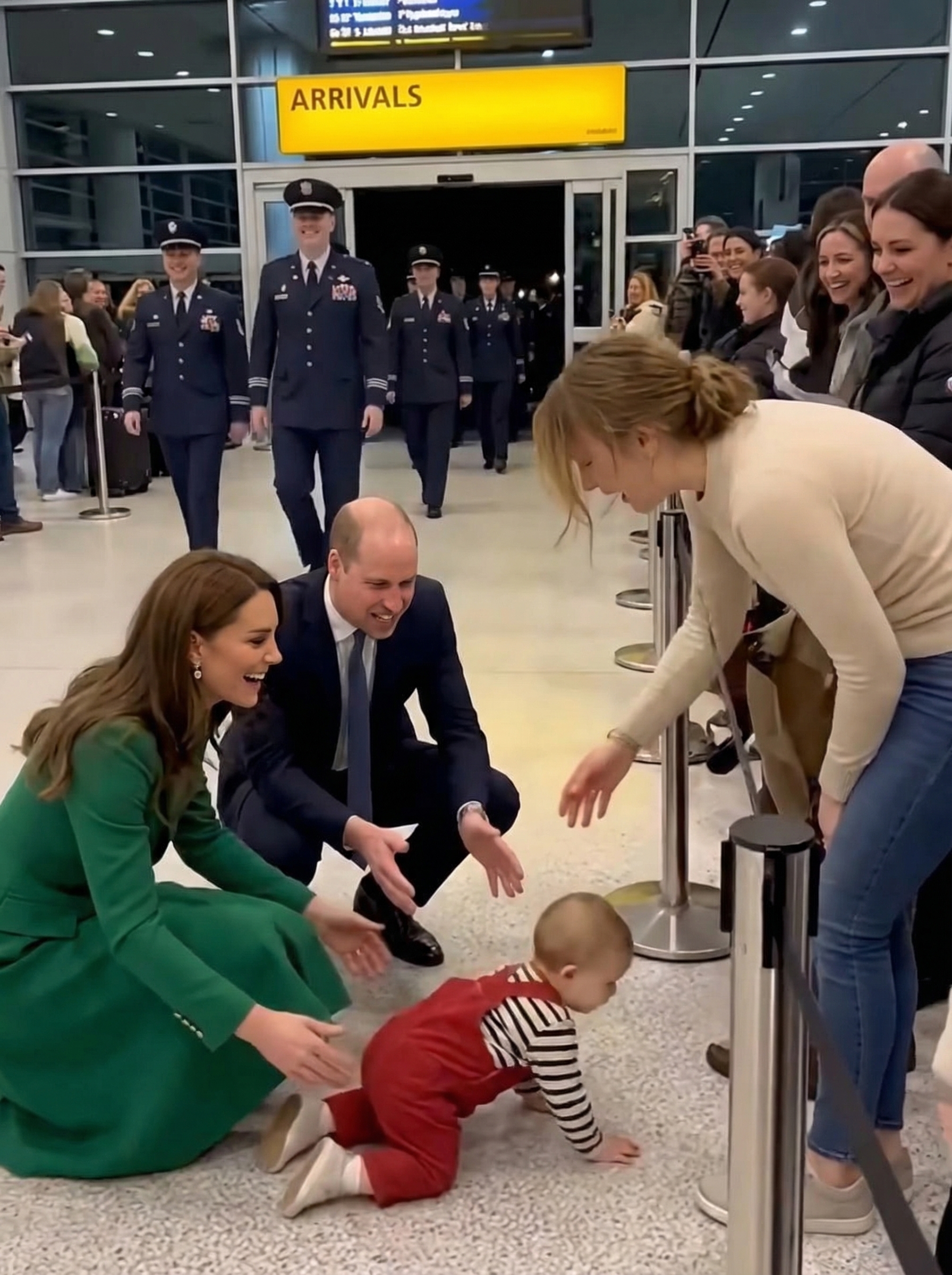 Instead of being startled or calling for security, Princess Catherine immediately turned the potential disaster into a moment of pure magic. With her signature radiant smile, she knelt down to the baby’s level, her eyes full of affectionate warmth. 💖🌟